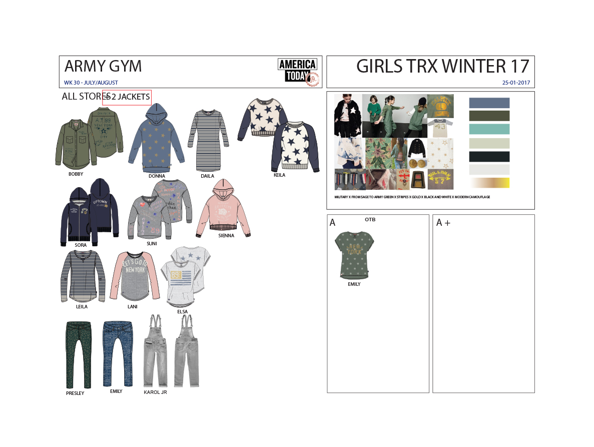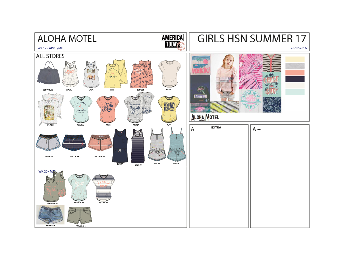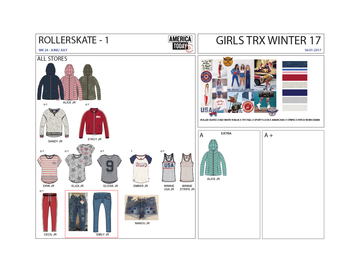 During my 3th year at AMFI I did an internship at America Today. America Today is a retail company that translates the all American campus lifestyle into a variety of styles, like jogging pants, hoodies, sweats, tee's and jeans. Together with two other designers I developed the summer and winter collections for kids. On the pictures you will find some collection overviews that I worked on and some pictures of the final products. After my internship I worked part-time during the summer period.